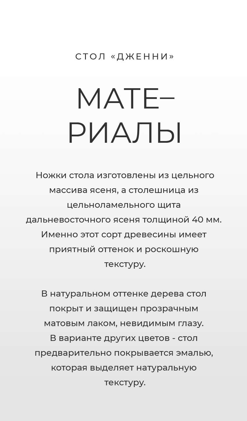 Ножки стола изготовлены из цельного массива ясеня, а столешница из цельноламельного щита дальневосточного ясеня толщиной 40 мм. Именно этот сорт древесины имеет приятный оттенок и роскошную текстуру.